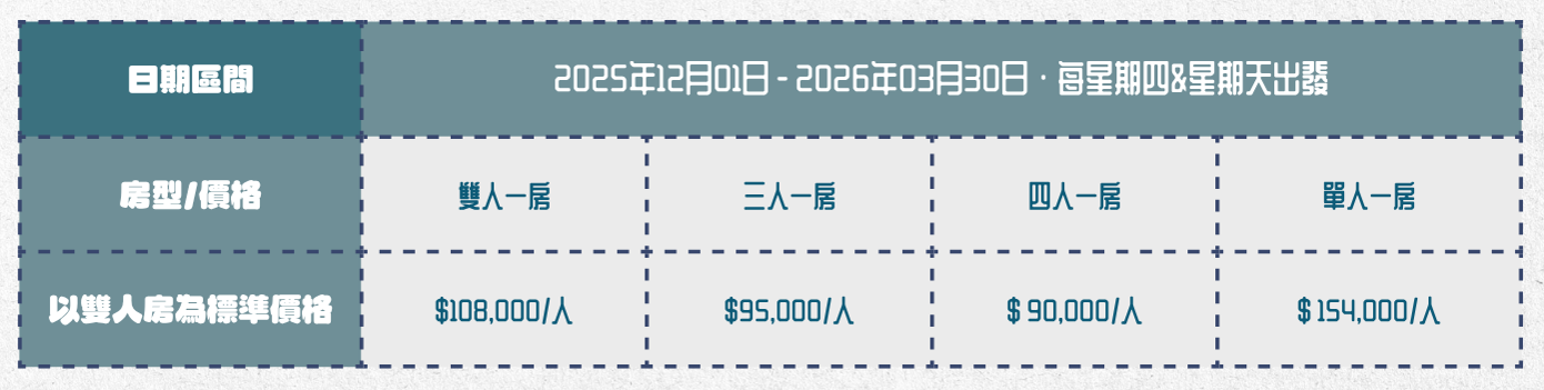 1. 行程需支付全款方可確認報名,未支付前無法保留位置,盡情諒解