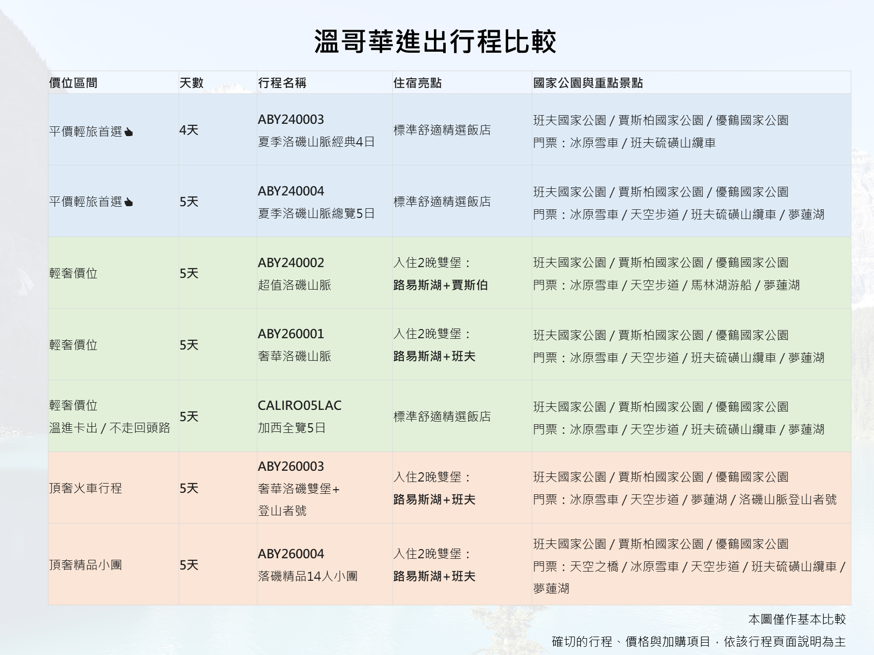 升級路易斯湖城堡飯店,為求完整體驗,行程將改為: