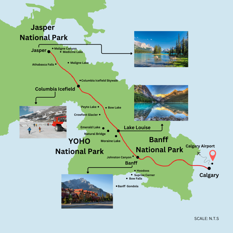●⠀暢遊冰原大道:沿著這條世界級的景觀公路,穿梭於萬年冰川、純淨碧綠湖泊和廣闊山谷之間。