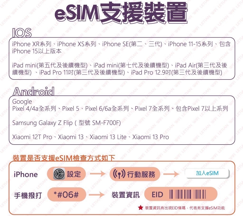 注意:鎖卡機、電信商自營品牌手機、3G手機、改裝機、中港澳出廠之手機不可使用,如不確定可聯繫業務詢問,eSIM訂單一經確認並傳送至Email後不可取消亦不可退款。