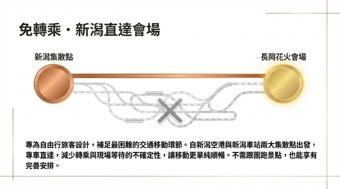 自新潟空港與新潟車站出發,直達長岡花火A區會場,