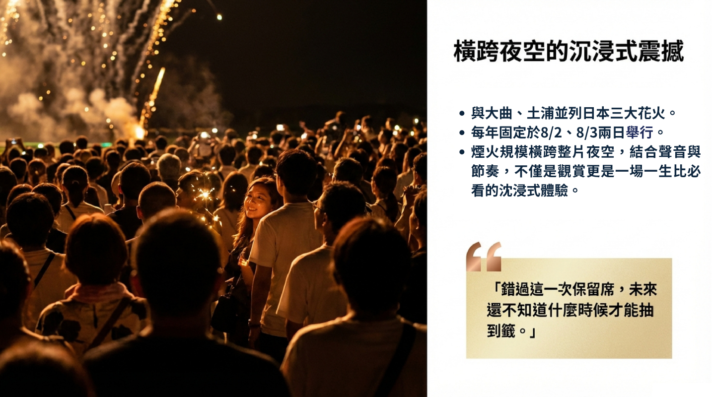 每年僅於夏夜短短兩日登場,以震撼規模與難得席次,成為許多人心中「一生至少要親眼看一次」的夢幻盛典。
