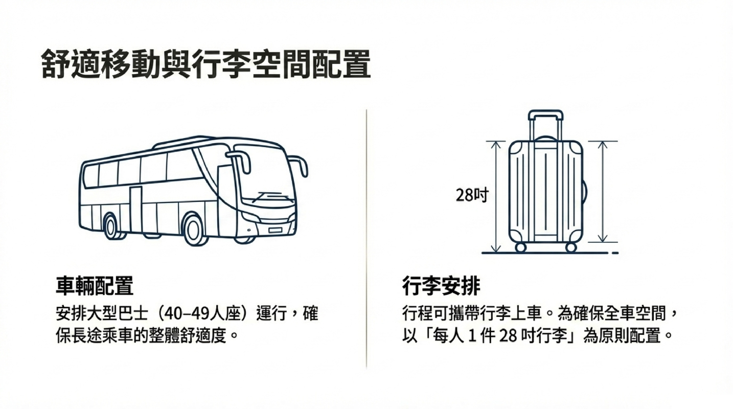 【行程提醒】實際行車時間可能受當日交通與活動管制影響;建議攜帶飲用水、雨具與必要的個人物品,並遵守現場工作人員指引,以確保乘車與入場安全。