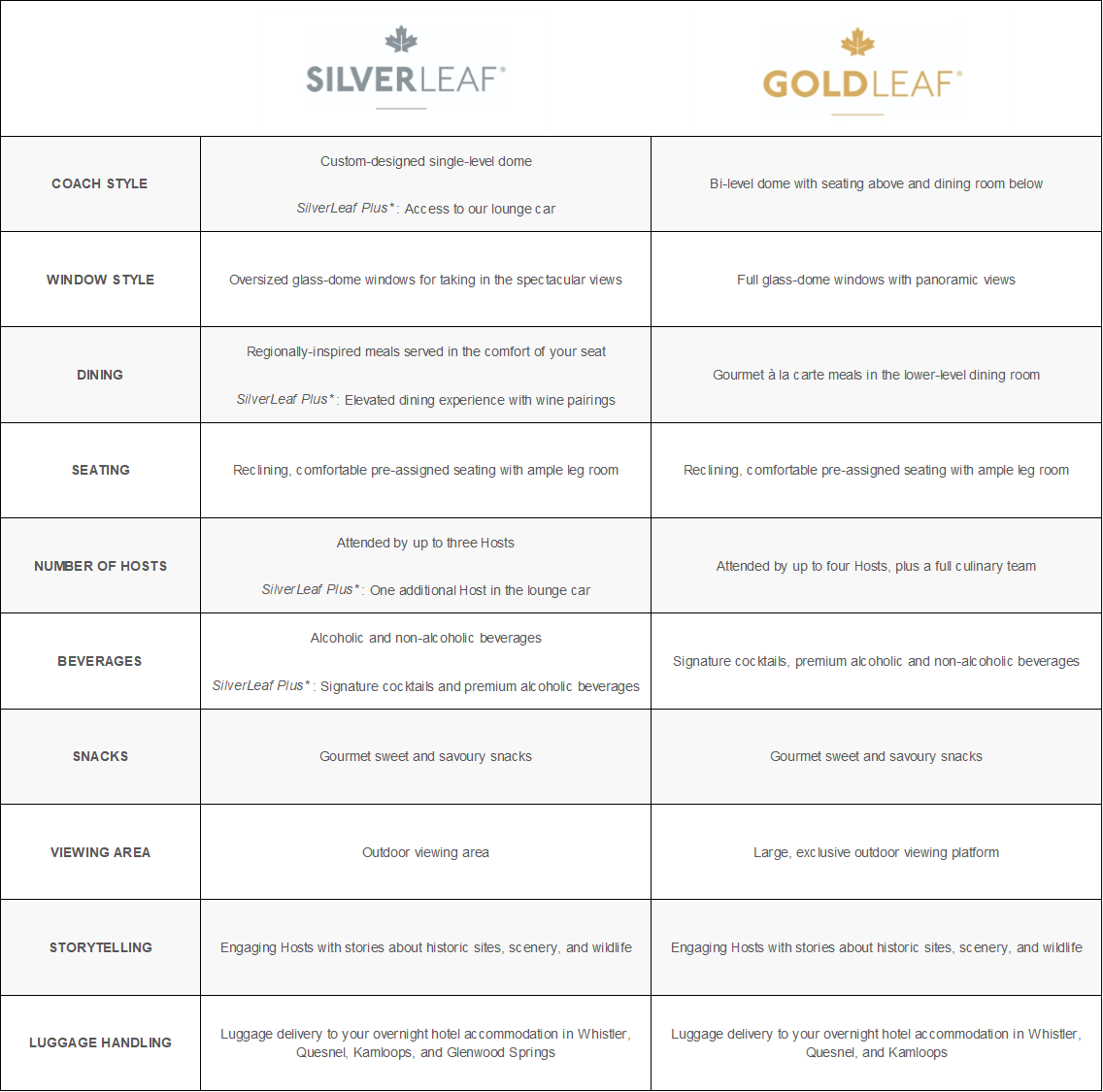 Rocky Mountaineer offers two levels of service: SilverLeaf and GoldLeaf.